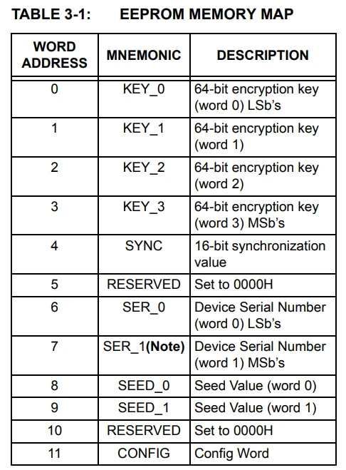 این تراشه یک EEPROM با ظرفیت ۱۹۲ بیت داره (12 × 16-bit words) که در ادامه Memory Map (ساختار حافظه) رو آوردم تا مشخص بشه چه پارامترهایی قابل بازنویسی هستند.